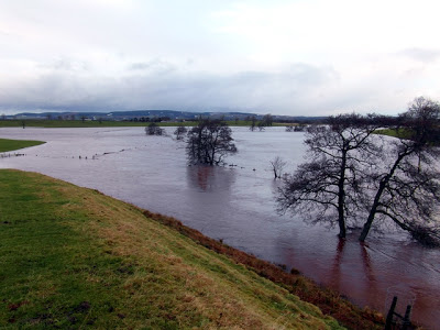 The sky is now blue again, although it's still very windy. It's two hours or so since I took the photos and already the water level has dropped quite a bit. I always wonder what happens to the creatures which live in and around the river when it floods, but they seem to cope! We saw a large hare this morning, and some swans were swimming happily on the new lake which had appeared! I'm not sure where the otters go, but they seem to come back eventually. We found a dead otter, sadly, by the roadside a few weeks ago, but have seen more otter tracks since then, so hopefully there must be several around.
